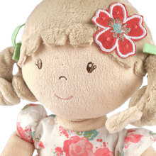 Flower kids Scarlet is a soft doll in a pretty floral dress. Her dress has pink and green flowers on it and she has a gorgeous flower in her hair with green ribbons.